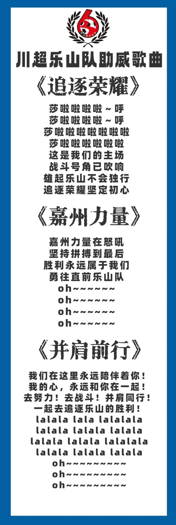 “胜利永远属于我们勇往直前乐山队”“这是我们的主场,战斗号角已吹响”“去努力!去战斗!并肩同行!一起去追逐乐山的胜利!”……歌词字里行间满是正能量,搭配明快的节奏与优美的旋律,既展现了对球队的殷切期许,也充满了鼓舞士气的力量,让人听后热血沸腾。