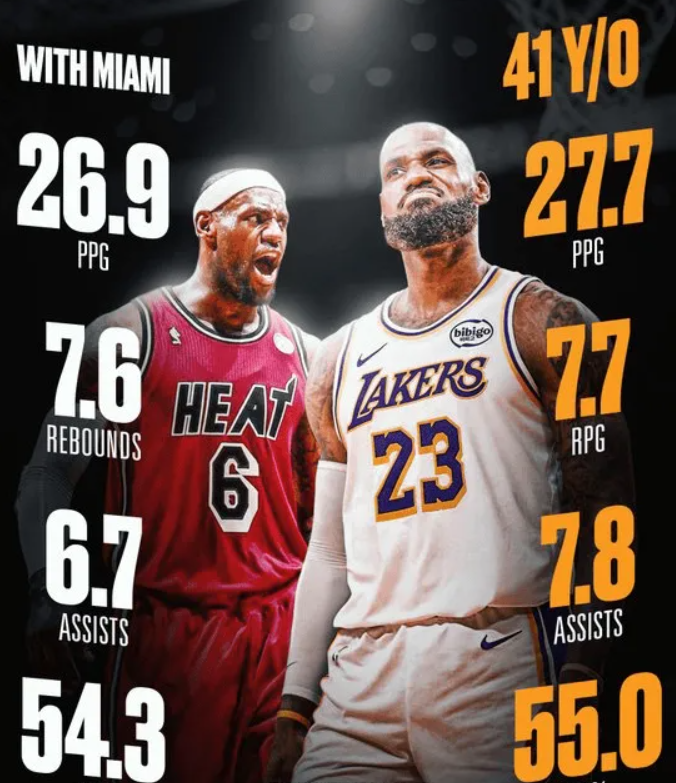 自从41岁生日夜以来,詹姆斯场均可以轰下 27.7分、7.7个篮板和7.8次助攻,投篮命中率高达55.0%,这一数据甚至超过了他热火时期的巅峰表现;他连续9场比赛得分超过20分,创造了40岁后NBA历史最长连续得分20+纪录;41岁场均得分榜,詹姆斯同样以22.6分排名历史第一。
