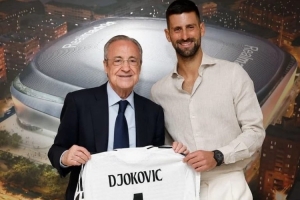 网坛传奇德约科维奇来到伯纳乌球场,现场观看皇马的比赛,他获赠皇马球衣,并与皇马主席弗洛伦蒂诺合影留念。
